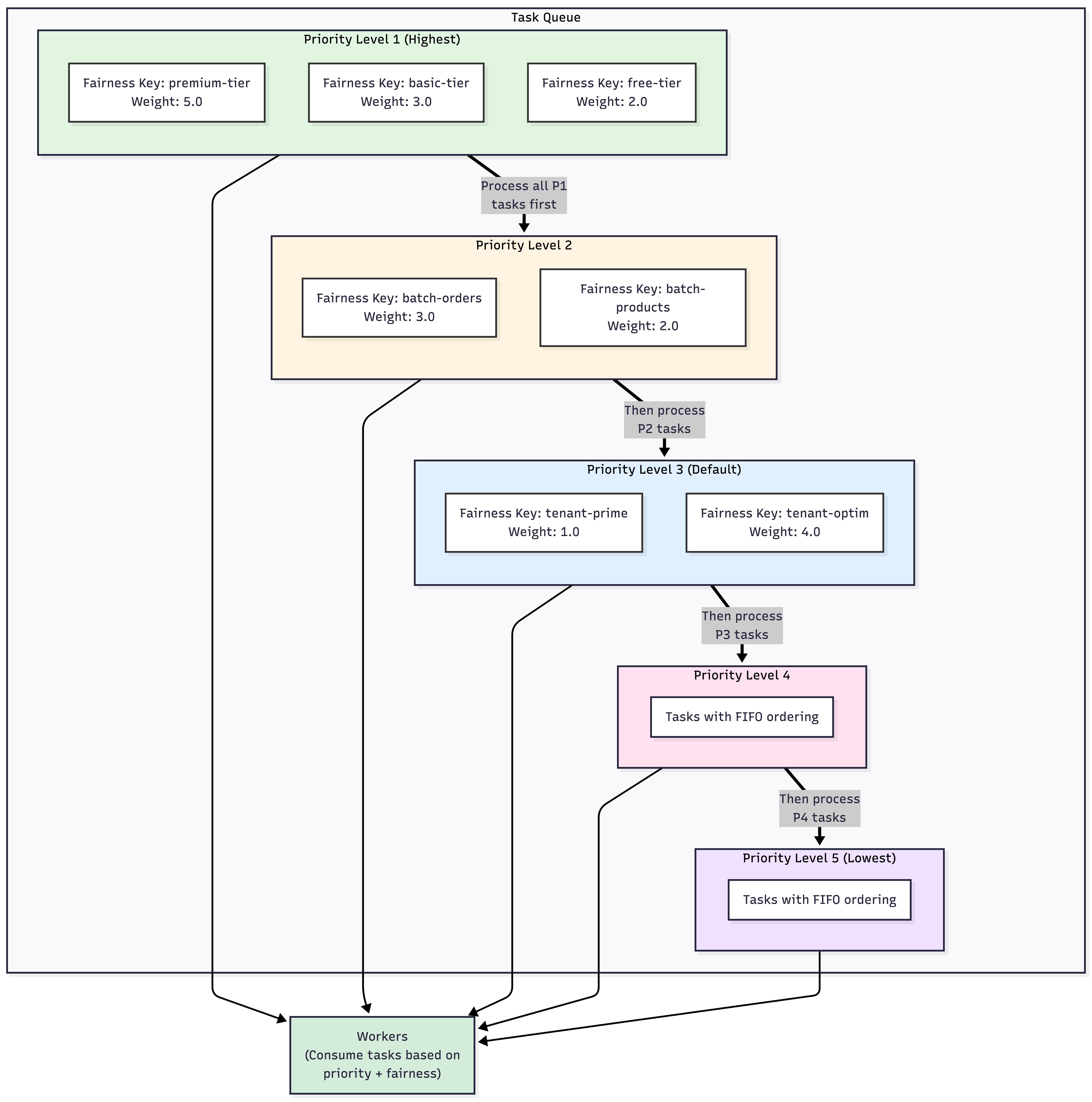 Task Queue Fairness lets you distribute Tasks based on fairness keys and their fairness weight within a Task Queue. The fairness keys are used to describe your Task structure. Each fairness key creates its own "virtual queue" within a Task Queue, allowing you to organize Tasks into logical groups like tenants, applications, or workload types.